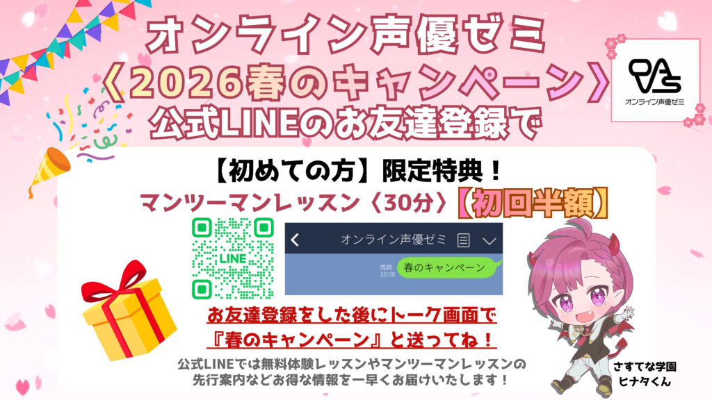 プロになれるか不安だったり、演技のお悩みがあるのでしたら、ぜひオンライン声優ゼミで直接ご指導を受けてみてはいかがでしょうか!